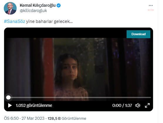 CHP Genel Başkanı ve Millet İttifakı Cumhurbaşkanı adayı Kemal Kılıçdaroğlu, seçim kampanyasını, resmi Twitter hesabından; “Sana söz yine baharlar gelecek” sözlerinin yer aldığı video paylaşımı ile başlattı.