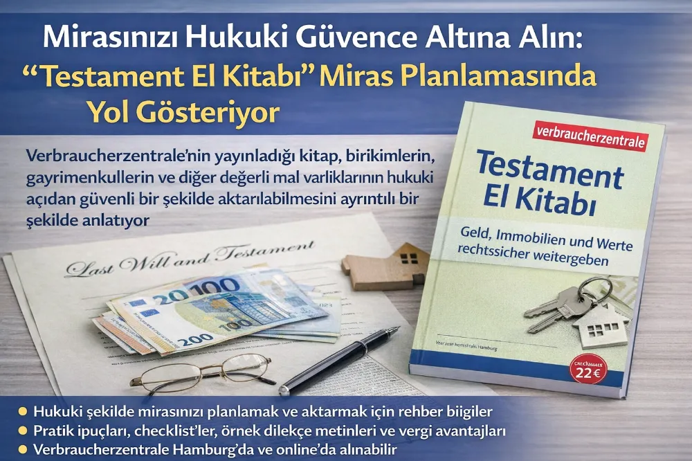 Tüketiciler Merkezi tarafından yayımlanan “Handbuch Testament”, miras hukukunun temel prensiplerini anlaşılır bir dille ele alarak, nakit varlıkların, gayrimenkullerin ve değerli eşyaların nasıl güvenli ve yasal biçimde devredilebileceğini ayrıntılı biçimde açıklıyor.