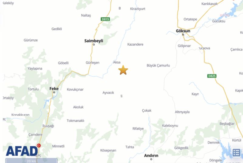 Adana’nın Saimbeyli ilçesinde, bugün saat 23:16’da 4.0 büyüklüğünde deprem oldu. Afet ve Acil Durum Yönetimi (AFAD) Başkanlığı, Adana’nın Saimbeyli ilçesinde, bugün saat 23:16’da 7 kilometre derinlikte ve 4.0 büyüklüğünde deprem olduğunu açıkladı.
