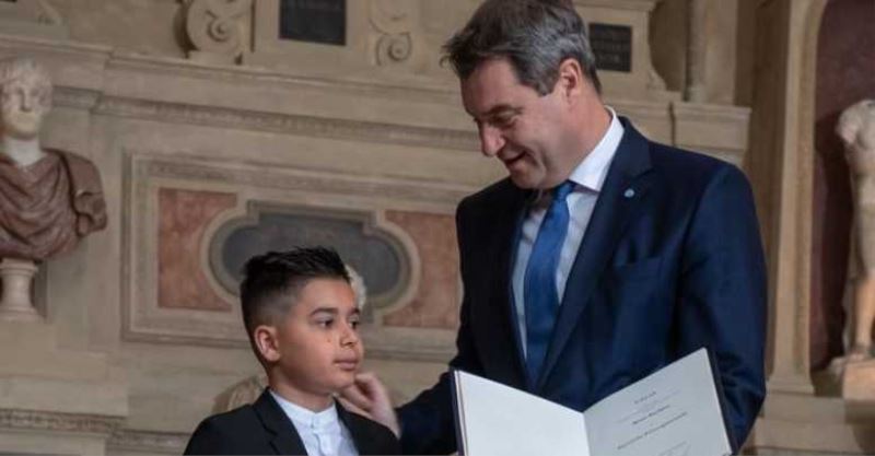 Bavyera eyaletinin başkenti Münih'te düzenlenen törende 10 yaşındaki Kenan Büyükhan'a ödülü Bavyera Başbakanı Markus Söder tarafından takdim edildi.
