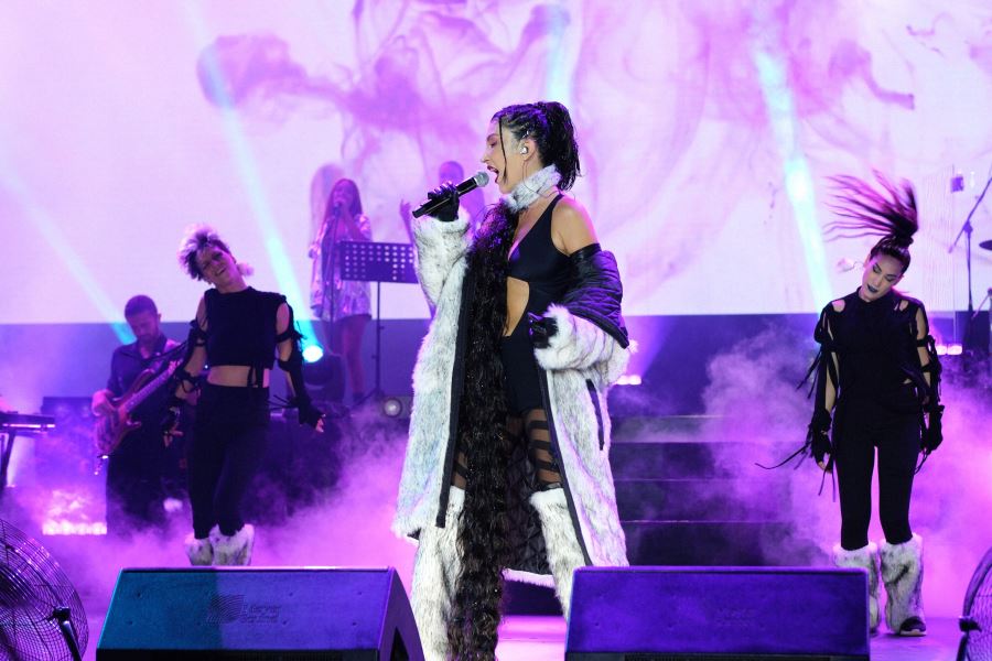 Ünlü Pop Yıldızı Hande Yener Paraf Kuruçeşme Açıkhava Konseri'nde, baştan aşağı pelüşle kaplanansahne kıyafeti ve ikonik gözlükleriyle dikkat çekti.