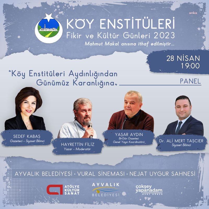 Köy enstitüsü araştırmacısı-yazar Hayrettin Filiz moderatörlüğünde 28 Nisan'da gazeteciler Sedef Kabaş, Yaşar Aydın ve Siyaset Bilimci Dr. Ali Mert Taşcıer'in konuşmacı olarak katılacağı ‘Köy Enstitüleri Aydınlığından Günümüz Karanlığına’ başlıklı panel yapılacak. Tarihçi ve yazar Sinan Meydan, 29 Nisan günü saat 16.00'da ‘Kuruluşundan, Kapatılışına Köy Enstitüleri’ başlıklı söyleşisi ile yurttaşları aydınlatacak. Aynı günün akşamında saat 20.00'de ‘Yarım Kalan Mucize’ filmi ücretsiz olarak gösterime sunulacak. Son olarak 30 Nisan günü saat 16.00'da toplum bilimci, yazar ve akademisyen Prof. Dr. Emre Kongar ‘Köy Enstitüleri'nin Toplumsal Yansımaları’ adlı söyleşi ve sonrasında kitap imzası ile Ayvalıklılar ile buluşacak.