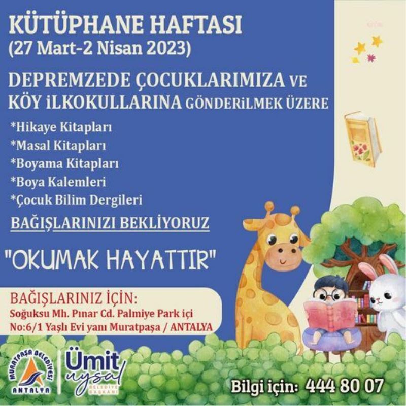 Türkiye’yi sarsan deprem felaketinin ardından bölgede birden çok alanda çalışmalar gerçekleştiren Muratpaşa Belediyesi, şimdi de anlamlı bir kampanyanın öncülüğünü yapıyor. Muratpaşa Belediyesi, 27 Mart – 2 Nisan Kütüphane Haftası dolayısıyla hem deprem bölgesindeki çocuklar hem de köy okullarındaki öğrenciler için kitap kampanyası başlattı.