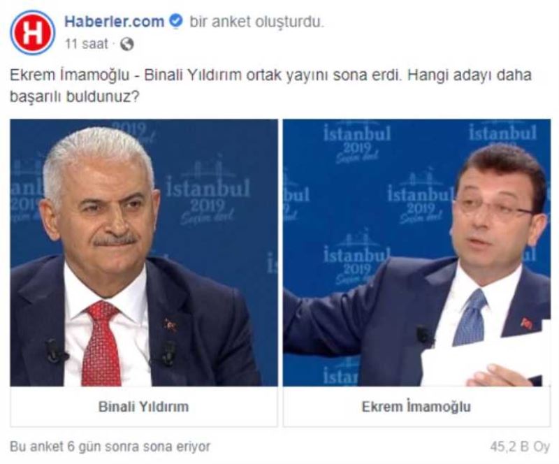 Sosyal medyadan yapılan ankete 11 saatte 45 bin kullanıcı katıldı. 20 bin kullanıcı Binali Yıldırım'ı başarılı bulurken, 25 bin kullanıcı Ekrem İmamoğlu'nu başarılı buldu.