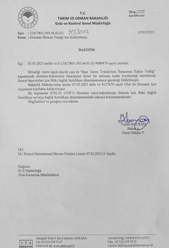 "Bazı Tarım Ürünlerinin İhracatına İlişkin Tebliğ' kapsamında domates ürünlerinin ihracatının ikinci bir talimata kadar kısıtlandığı belirtilerek, ihracat başvuruları için Bitki Sağlık Sertifikası düzenlenmemesi gerektiği bildirilmiştir. Bakanlık Makamından alınan 07.03.2023 tarih ve 9127479 sayılı olur ile domates için uygulanan kısıtlama kaldırılmıştır. Bu kapsamda, domates (taze/soğutulmuş) ihracatı için Bitki Sağlık Sertifikası düzenlenmesinde sakınca bulunmamaktadır."