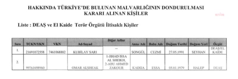 Kubilay Sarı ve Omar Alsheak’ın Türkiye’deki malvarlıklarının dondurulmasını ilişkin karar, Resmi Gazete’nin bugün mükerrer sayısında yayınlanarak yürürlüğe girdi. İçişleri Bakanı Süleyman Soylu ile Hazine ve Maliye Bakanı Nureddin Nebati’nin imzası ile yayınlanan karara göre; Sarı ve Alsheak’ın Türkiye’deki malvarlıkları, terör örgütleri IŞİD ve El Kaide ile bağlantılı olduğu gerekçesiyle donduruldu. Karar şöyle: