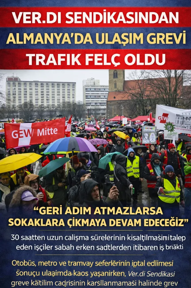 Almanya'nın en büyük sendikalarından Birleşmiş Hizmet Sektörü Sendikasının (Ver.di) çağrısıyla, Almanya genelinde yaklaşık 150 belediye ulaşım şirketinde çalışan 100 bin işçi, çalışma koşullarının iyileştirilmesi talebiyle saat 03.00 itibarıyla iş bıraktı.