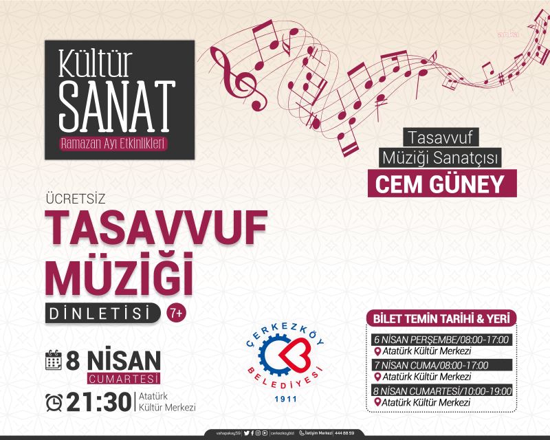 Çerkezköy Belediyesi Kültür ve Sosyal İşler Müdürlüğü tarafından cumartesi günü gerçekleştirilecek tasavvuf müziği dinletisinin ücretsiz biletleri, 6-7 Nisan günleri 08.00-17.00 saatleri arasında; 8 Nisan cumartesi günü ise 10.00-19.00 saatleri arasında Atatürk Kültür Merkezi gişelerinden temin edilebilecek.