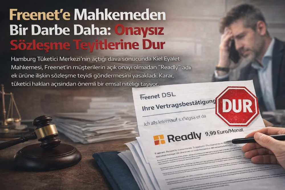 Almanya’da telekomünikasyon sektöründeki tartışmalı satış yöntemlerine karşı yeni bir yargı kararı çıktı. Hamburg Tüketici Merkezi (Verbraucherzentrale Hamburg), Freenet DLS GmbH’ye karşı açtığı davada bir kez daha başarı elde etti. Kiel Eyalet Mahkemesi (Landgericht Kiel), 13 Şubat 2026 tarihli kararında şirketin, müşterilerin açık rızası olmadan “Readly” adlı ücretli ek ürüne ilişkin sözleşme teyidi göndermesini durdurdu (Az. 3 O 1/26).