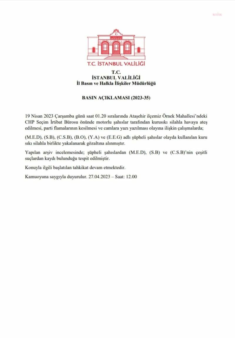 "19 Nisan 2023 Çarşamba günü saat 01.20 sıralarında Ataşehir ilçemiz Örnek Mahallesi’ndeki CHP Seçim İrtibat Bürosu önünde motorlu şahıslar tarafından kurusıkı silahla havaya ateş edilmesi, parti flamalarının kesilmesi ve camlara yazı yazılması olayına ilişkin çalışmalarda; (M.E.D), (S.B), (C.S.B), (B.O), (Y.A) ve (E.E.G) adlı şüpheli şahıslar olayda kullanılan kuru sıkı silahla birlikte yakalanarak gözaltına alınmıştır.