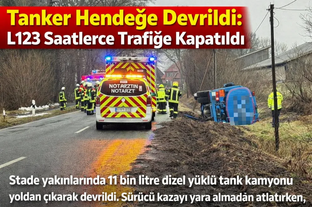 Edinilen bilgilere göre, 54 yaşındaki sürücü Mercedes marka tank kamyonuyla Bargstedt yönüne ilerlerken henüz bilinmeyen bir nedenle aracın sağ ön tekerleği yol kenarına çıktı. Yağış nedeniyle yumuşayan zeminde kontrolü sağlayamayan sürücü, yaklaşık 11 bin litre dizel yüklü aracı yeniden yola döndüremedi. Tanker yol kenarındaki hendeğe devrilerek yan yattı.