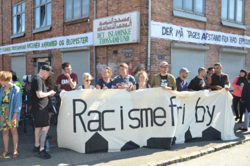 Sosyal medya üzerinden yapılan çağrıya Müslümanların yanı sıra çok sayıda Danimarkalı da katıldı. Yaklaşık bin 400 kişi cami yakınında bir araya geldi. Bir grup Danimarkalının taşıdığı "Racismefri by - ırkçılık olmayan şehir" pankartı dikkat çekti.