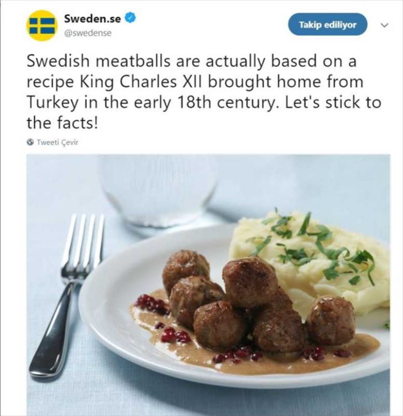Twitter hesabı "Sweden.se"den yapılan paylaşımda, köfte fotoğrafı kullanılarak, ''İsveç köfteleri, aslında Kral 12. Karl'ın Türkiye'den eve getirdiği tarife dayanıyor. Gerçeklere bağlı kalalım.” ifadeleri kullanıldı.