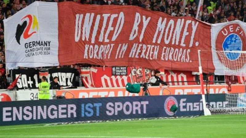 Stuttgart'ın dün Fortuna Düsseldorf'u ağırladığı karşılaşmada ise taraftarlar, astıkları büyük pankartla DFB'ye tepki gösterdi. Federasyonun adaylık logosu ve UEFA bayrağının yer aldığı pankartta, EURO 2024 için hazırlanan, "Futbol bizi birleştirir." sloganı değiştirilerek, "Sizi para birleştirir. Avrupa futbolunun kalbinde yozlaşma." ifadeleri kullanıldı.