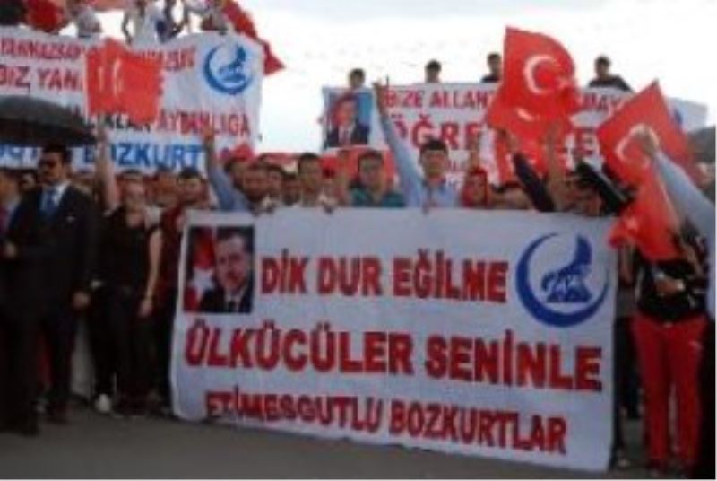 'Milli İradeye Saygı' mitingi için Ankara'nın Sincan ilçesine giden Başbakan Recep Tayyip Erdoğan’ın konvoyunu MHP’li gençler karşıladı. ‘Dik dur eğilme ülkücüler seninle’ sloganları atan grup Başbakan'ı bozkurt işaretleri ile