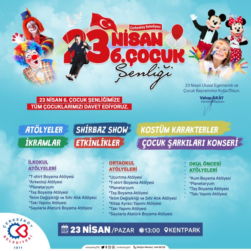 Çerkezköy Belediyesi 6. Çocuk Şenliği’nin 23 Nisan Pazar günü saat 13.00’da başlayacağını belirten Belediye Başkan Vahap Akay, “23 Nisan Çocuk Şenliğimizin içerisinde çocuklarımızın eğleneceği, güzel vakit geçireceği gösteriler ve aktiviteler olacak. Saat 17.00’ye kadar sürecek Şenliğimizde çocuklarımız için çeşitli atölyeler, sihirbaz gösterileri, çocuk şarkıları konserleri, kostüm gösterileri ve çocuklarımız için çeşitli ikramlarımız olacak” dedi.