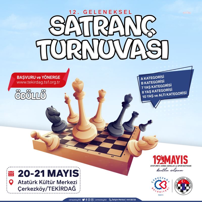 Çerkezköy Belediyesi Gençlik ve Spor Hizmetleri Müdürlüğü tarafından düzenlenecek 19 Mayıs Atatürk’ü Anma Gençlik ve Spor Bayramı 12. Geleneksel Satranç Turnuvası’na katılmak isteyenler, başvurularını Türkiye Satranç Federasyonu www.tekirdag.tsf.org.tr adresi üzerinden online olarak yapabilecekler.