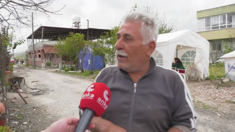 “Deprem oldu bize soran yok. Zorla, kavgayla çadır aldık. Zorla, kavgayla erzak aldık. Üç aydır aylık almıyorum. Ben asgari ücretle çalışıyordum, sigortalıydım. Düştüm ayağım gitti, diz kapağım değişti. Daha bir yardım almadım. Bir 10 bin lira işte ev için mi, bilmem ne için verdiler ondan hariç 1 lira almış değilim. Daha battaniyelerin üstünde yatıyoruz. Yani yatacak yatağımız yok. Evin içinde, duvarlar yıkılmış, tamam ihtar veriyorlar, ‘eve girmeyin’ girmiyoruz. İki de bir yine sallanıyor. O korkudan dolayı eve giremiyoruz. Çadırın içine bak, git çek çadırın içini çek, battaniyelere yatıyoruz. Çadırda nasıl yaşayacağız, 10-15 gün sonra? Sıcak geliyor, sıcak basıyor. Şimdiden sivrisinek başladı bizim burada… Yarın 10-15 gün sonra bu sıcakta nasıl yaşayacağız bu çadırların altında? Konteyner kent yapmış, ben buramı nasıl bırakıp da konteyner kente gideceğim? Evim az hasarlı… Bir sürü sorunlar var.