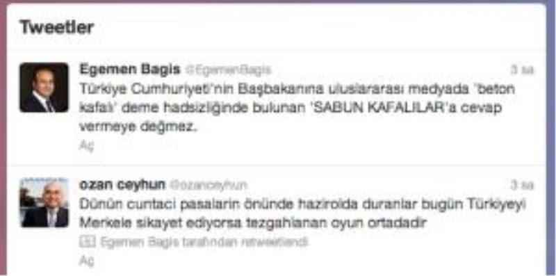 Bakan Bağış’ın hesabında ayrıca Avrupa Parlamentosu’nun eski Türk kökenli Alman Milletvekili Ozan Ceyhun’un tweet’ini Retweet yapması da dikkat çekti.