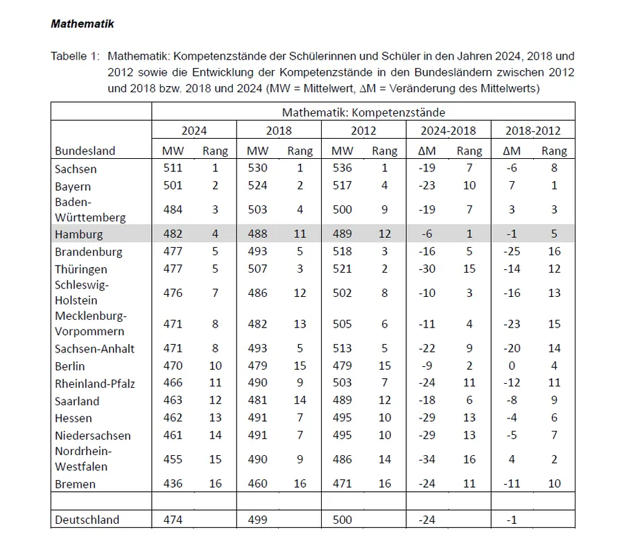 Rapor, Kültür Bakanları Konferansı (KMK) adına Eğitim Kalitesini Geliştirme Enstitüsü (IQB Berlin) tarafından hazırlandı. Almanya genelinde son altı yılda öğrencilerin matematik, biyoloji, kimya ve fizikteki ortalama performansları düşerken, Hamburg tüm alanlarda seviyesini koruyan tek eyalet oldu.