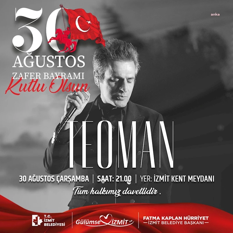 İzmit Belediyesi, 30 Ağustos Zafer Bayramı kutlamaları için dolu bir program hazırladı. Gün boyu sürecek kutlama etkinliklerinin finalinde ünlü şarkıcı Teoman birbirinden güzel şarkılarıyla Kent Meydanı’nda sahne alacak.