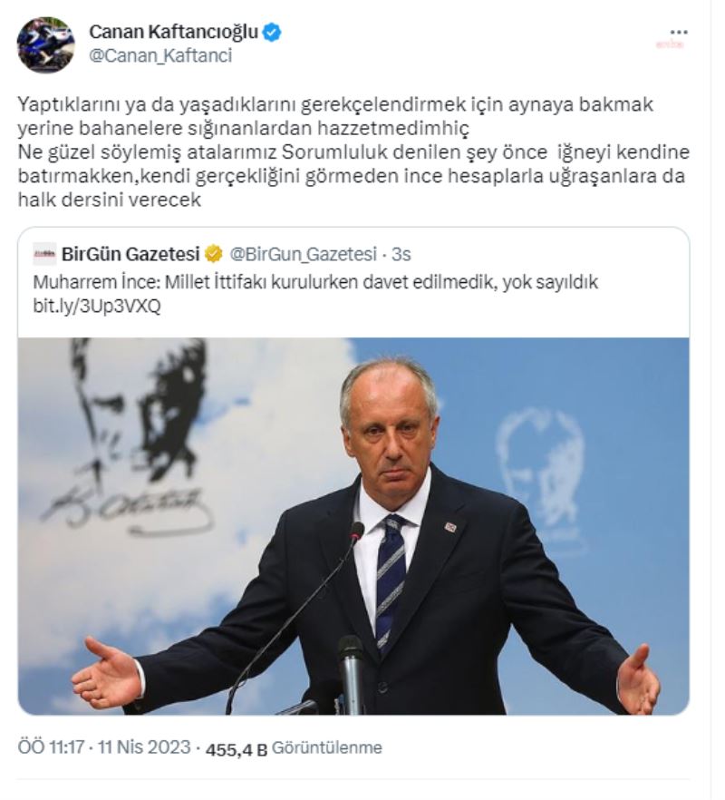 CHP İstanbul İl Başkanı Canan Kaftancıoğlu, Memleket Partisi Genel Başkanı ve Cumhurbaşkanı Adayı Muharrem İnce'nin "Millet İttifakı kurulurken davet edilmedik, yok sayıldık" sözlerine Twitter hesabından, “Sorumluluk denilen şey, önce iğneyi kendine batırmakken, kendi gerçekliğini görmeden, ince hesaplarla uğraşanlara da halk dersini verecek” cevabını verdi.