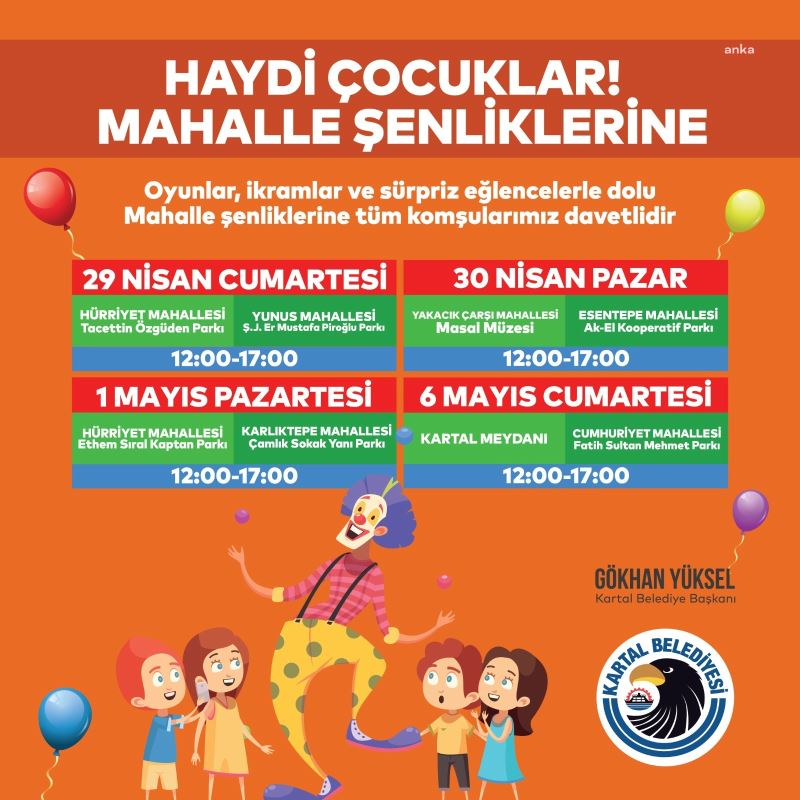 Hürriyet, Yunus, Yakacık Çarşı, Esentepe, Karlıktepe ve Cumhuriyet Mahallesi ile Kartal Meydanı’nda yapılacak mahalle şenliklerinde birbirinden farklı etkinlikler, 12.00-17.00 saatleri arasında düzenlenecek.