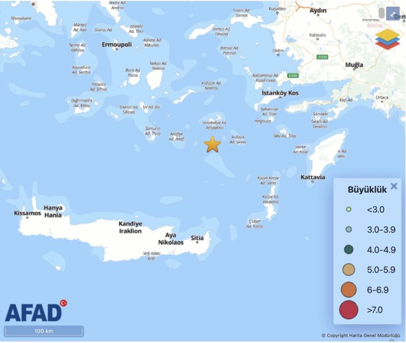 AFAD; Muğla'nın Datça ilçesi açıklarında, bugün saat 23.00'te, 54.16 kilometre derinlikte, 5 büyüklüğünde deprem olduğunu açıkladı. Kandilli Rasathanesi ise depremin merkez üssünün Akdeniz olduğunu ve 118.4 kilometre derinlikte, 4.8 büyüklüğünde olduğunu bildirdi.