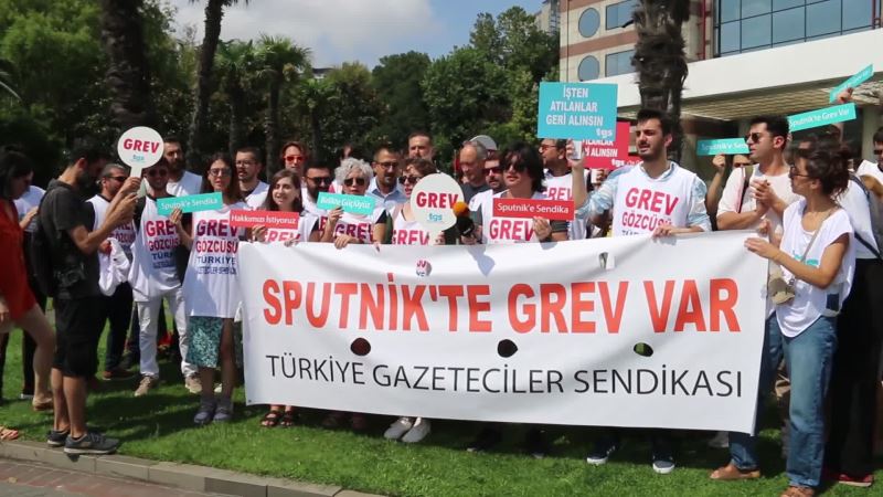 Uluslararası haber ajansı Sputnik Türkiye çalışanları, toplu iş sözleşmesi görüşmelerinde uzlaşma sağlanamaması ve bu arada 24 gazetecinin de işine son verilmesi üzerine bugün greve çıktı. Türkiye Gazeteciler Sendikası (TGS) Genel Başkanı Gökhan Durmuş, "Bu grev, Türkiye’de güvencesiz ve düşük ücretle çalışan tüm gazetecilerin grevidir. Bugün buraya grev pankartımızı asıyoruz. 24 üyemiz işe geri alınacak, taleplerimiz kabul edilecek ve toplu iş sözleşmesi imzalanacak. İşte o zaman bu grev pankartı inecek" dedi.